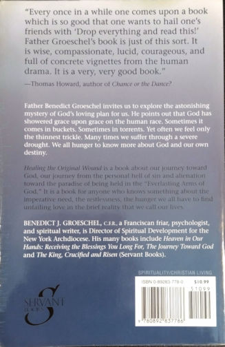 Father Benedict Groeschel invites us to explore the astonishing mystery of God’s loving plan for us. We all hunger to know more about God and our own destiny. Healing the Original Wound is a book about our journey toward God, our journey from the personal hell of sin and alienation toward the paradise of being held in the Everlasting Arms of God. It is a book for anyone who knows something about the imperative need, the restlessness, the hunger we all have to find unfailing love in the brief reality that we call our lives.Â