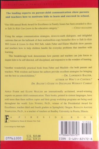 The leading experts on parent-child communication show parents and teachers how to motivate kids to learn and succeed in school. Using the unique communication strategies, down-to-earth dialogues, and delightful cartoons that are the hallmark of their multimillion-copy bestseller How to Talk So Kids Will Listen and Listen So Kids Will Talk, Adele Faber and Elaine Mazlish show parents and teachers how to help children handle the everyday problems that interfere with learning.