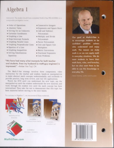This level teaches all basic algebra concepts. These include basic properties, solving equations (including simultaneous equations), coin problems, exponents and square roots, scientific notation, unit multipliers, and metric conversions. Graphing lines is taught in detail, and graphing conic sections is introduced. Operations with polynomials are demonstrated with place-value blocks for conceptual understanding before being taught conventionally.