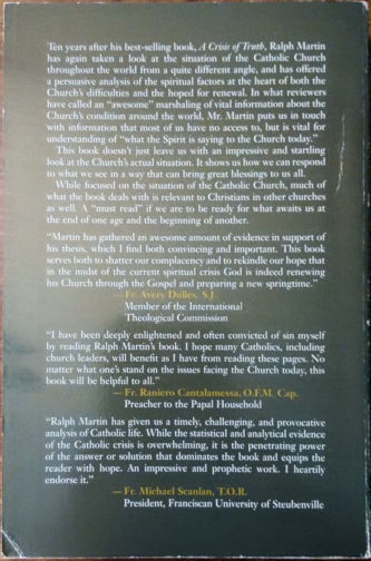 Ralph Martin has taken a look at the situation of the Catholic Church throughout the world from a quite different angle, and has offered a persuasive analysis of the spiritual factors at the heart of both the Church’s difficulties and the hoped for renewal. This book doesn’t just leave us with an impressive and startling look at the Church’s actual situation. It shows us how we can respond to what we see in a way that can bring great blessings to us all. While focused on the situation of the Catholic Church, much of what the book deals with is relevant to Christians in other churches as well.