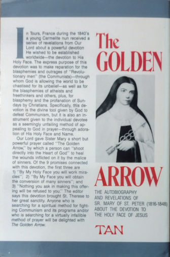 The Golden Arrow tells of both the life of Sister Mary of Saint Peter and her life’s work: the devotion, granted to her by Jesus Himself, to His Holy Face. Soon after entering the Carmelite convent at Tours in 1839 at age 23, Sister Mary began to receive remarkable and intimate communications from Our Lord, Who told her of His great distressed over the evil actions and blasphemous declarations of the Marxist revolutionaries of the time. He also bemoaned the indifference to and profanation of Sunday and Holy Days of Obligation of even Christians. These errors, begun in Sister Mary’s time, have grown monstrously ingrained in our present fearful age. Approved by Pope Leo XIII and promoted by St. Therese of Lisieux half a century later, the devotion to the Holy Face may be the single most important devotion of our time that still remains relatively unknown.