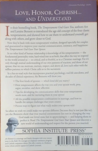 In their bestselling book, The Temperament God Gave You, authors Art and Laraine Bennett re-introduced the age-old concept of the four classic temperaments, and showed how to use them to understand yourself, get along with others, and grow closer to God. Now they’re back with more temperament wisdom, designed specially for couples and guaranteed to improve your marital communication, intimacy, and happiness. For it’s only through mutual understanding of our own patterns of reaction, and those of our spouse, that we can motivate, nurture, respect, and above all, love each other with the selfless patience to which Christ calls us in the sacrament. So often we wish we could make our spouses different (because they’re not just like us); yet the Bennetts show that true marital contentment lies not in changing the way God made our loved ones, but in appreciating it — and helping them to perfect it.